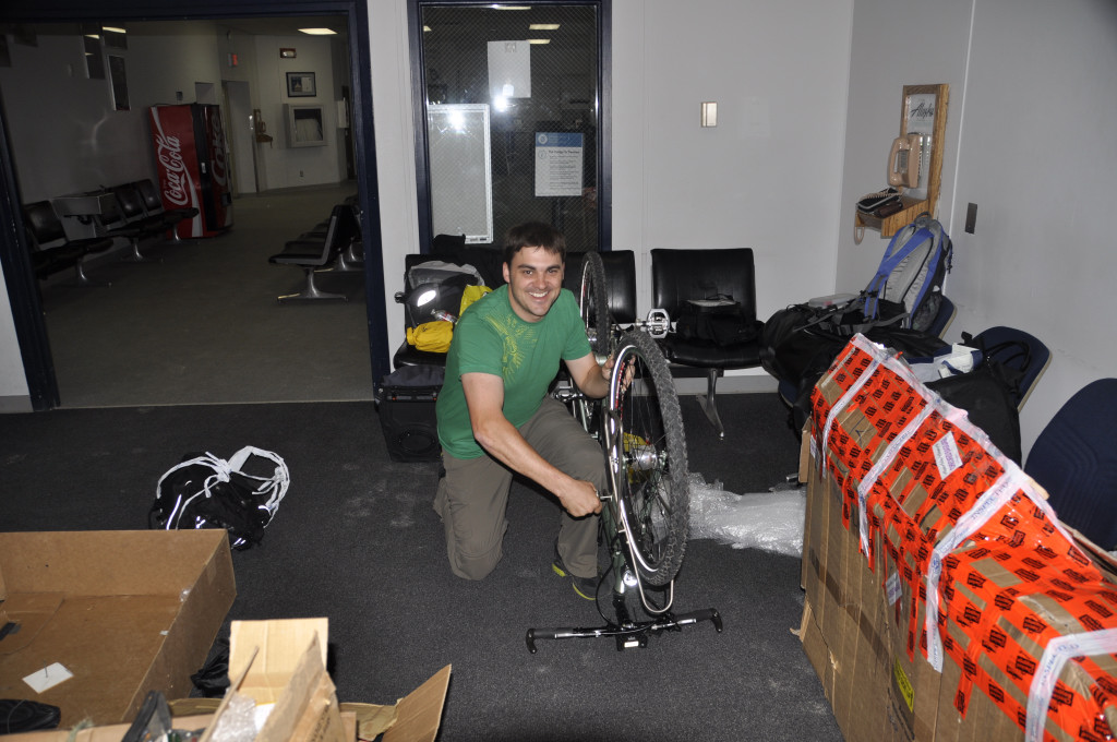Mit nicht allzu viel Schlaf beladen Simone und ich Frey's roten VW-Bus. Am Flughafen drehen wir erst drei Runden um die ganzen Parkhäuser, weil wir wegen der Höhe einen nicht allzu weit entfernten Outdoor-PP brauchen. Beim Check-in dann noch die bange Frage, ob sie mir den Camping-Kocher durchgehen lassen - ja sie tun es. Beim Bike verdrehen sie zwar etwas die Augen, aber können gar nicht anders als es mitnehmen.